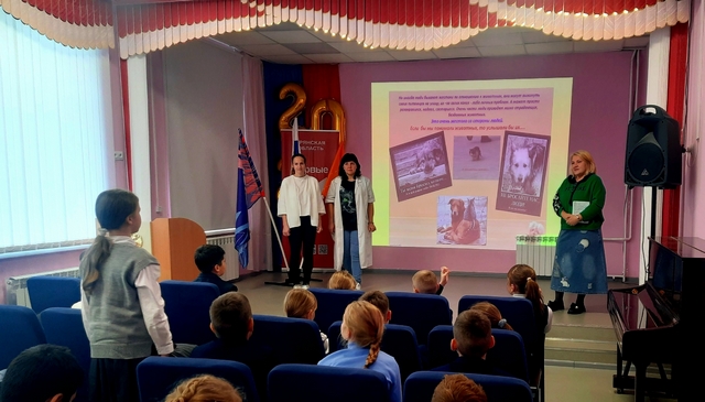 Ветврач Ольга Сергеевна подробно рассказала ребятам об опасном для животных и людей заболевании - бешенство и о том, как вести себя, если мы сталкиваемся с агрессивным поведением у собак, а также объяснила ребятам, как правильно поступить в случае укуса собакой или кошкой, представила алгоритм действий при таком инциденте. Волонтеры поделились своим опытом добровольческой деятельности, рассказали, как они спасают и помогают бездомным животным. Но главной целью выступающих было донести до ребят основную мысль: человек в ответе за все живое на планете. Мы должны любить и беречь природу, животных и птиц, заботиться о бездомных животных, ведь они беззащитны и не могут помочь себе сами. От людей в буквальном смысле зависят их жизни.