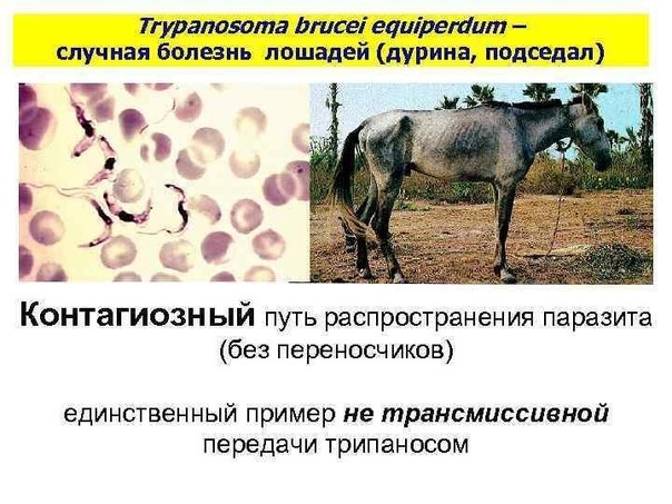 Попадая в организм при случке больных со здоровыми (дурина) трипаносомы из места внедрения после размножения проникают в кровь, лимфатические сосуды, где продолжается их продольное деление. Далее паразиты выходят в кровеносное русло и распространяются метастатическим путем по всем органам и тканям, проникают в сосуды всех паренхиматозных органов и вызывают воспалительные и дистрофические изменения. Такие изменения органов вызываются веществами, выделяемыми трипаносомами - трипанотоксинами и продуктами обмена.По мере размножения трипаносом, организм начинает вырабатывать антитела, которые разрушают трипаносомы. Освобождающиеся эндо- и экзотоксины вызывают лихорадочное состояние у больного животного. Таким образом, кровь на некоторое время освобождается от возбудителя. Однако, часть трипаносом сохраняется во внутренних органах и приобретает устойчивость к трипанолизинам. В последующем, оставшиеся трипаносомы размножаются и вновь попадают в кровеносное русло.