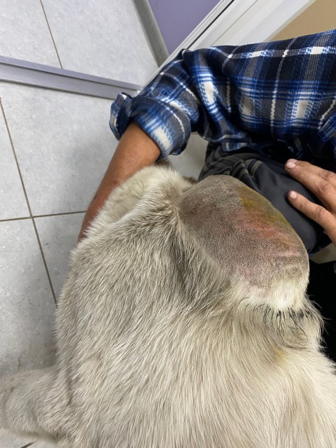 Поскольку рана у собаки была больших размеров, с повреждением мышечной ткани и связок, животное пришлось вводить в наркоз.